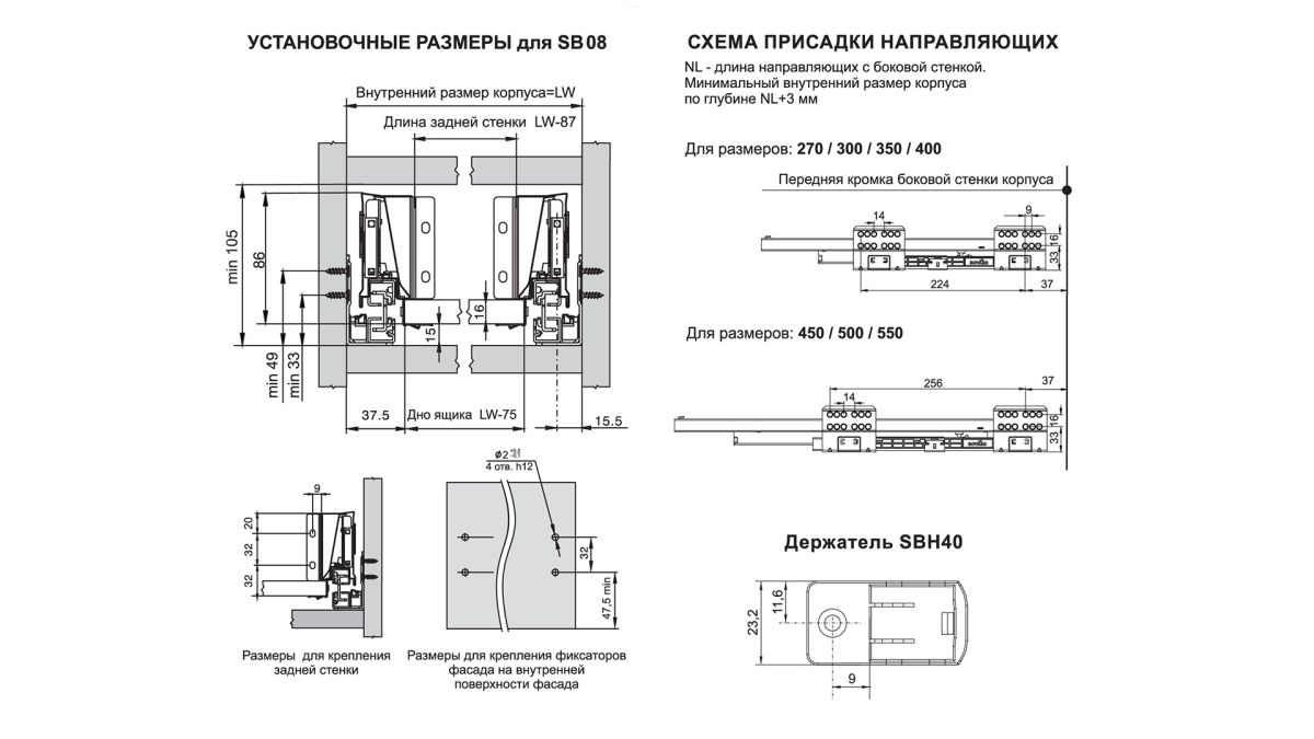 Направляющие оснащены зубчато-реечным механизмом синхронизации, который исключает перекосы при использовании и обеспечивает равномерный ход DB8181 имеют европейские стандарты присадки кратные 32 мм. Сами отверстия для крепления направляющих имеют диаметр 6 мм, что позволяет использовать евровинт при монтаже.