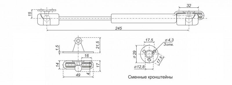 GL105 — газовый лифт для фасадов верхних баз корпусной мебели. Представлен в 3 вариантах номинального усилия: 50N, 80N и 100N.