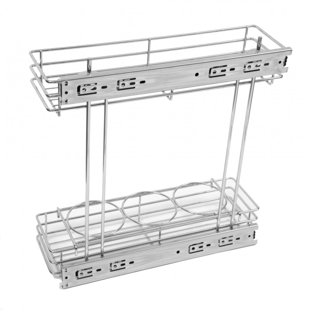 Вместительная выдвижная корзина предназначена для рациональной организации нижних модулей гарнитура в зоне хранения продуктов. «Первый этаж» двухуровневой системы имеет удобные ограничители – проволочные круги для упорядоченного и безопасного хранения банок, бутылок или сосудов, небольших кастрюль. Каждая банка, находясь на своем месте – в своей окружности, не упадет, не сместится, не разобьется.