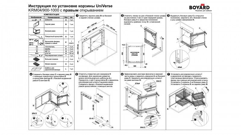 В комплекте с изделием поставляется специальный шаблон присадочных отверстий, который поможет точно определить место для крепления корзины. Шаблон является дополнением к основной инструкции и позволяет легко и быстро нанести разметку для установки сетчатого наполнения в базу кухонного гарнитура.