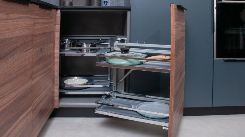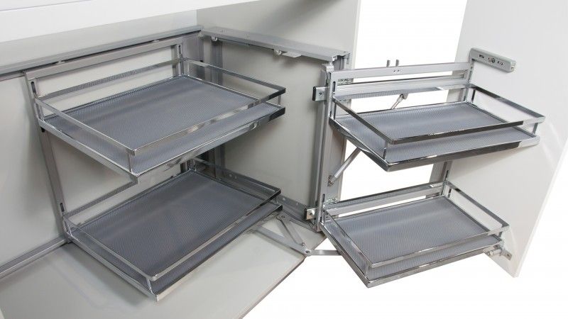 Поворотно-выкатной принцип выдвижения корзин обеспечивает легкий доступ в самые дальние уголки модуля, а два этажа корзин позволяют эргономично разместить множество предметов быта.