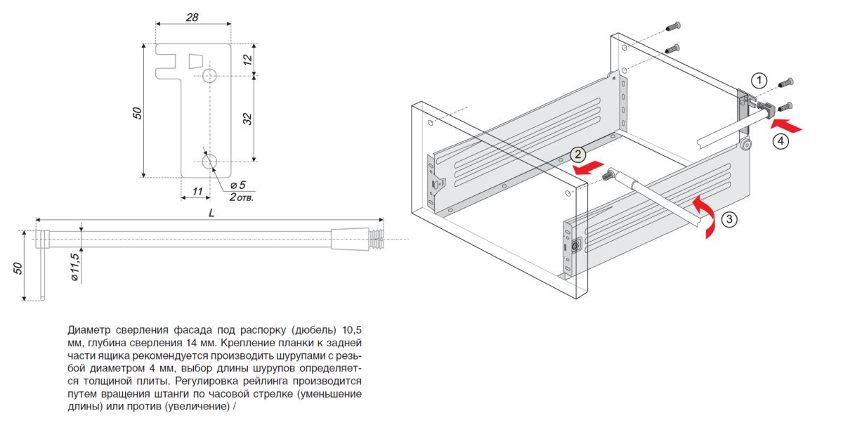Для установки необходимо просверлить в фасаде отверстие под распорку (дюбель) диаметром 10,5 мм, глубиной 14 мм. Крепление планки к задней части ящика рекомендуется производить шурупами с резьбой диаметром 4 мм, выбор длины шурупов определяется толщиной плиты. Регулировка рейлинга производится путем вращения штанги по часовой стрелке (уменьшение длины) или против (увеличение).