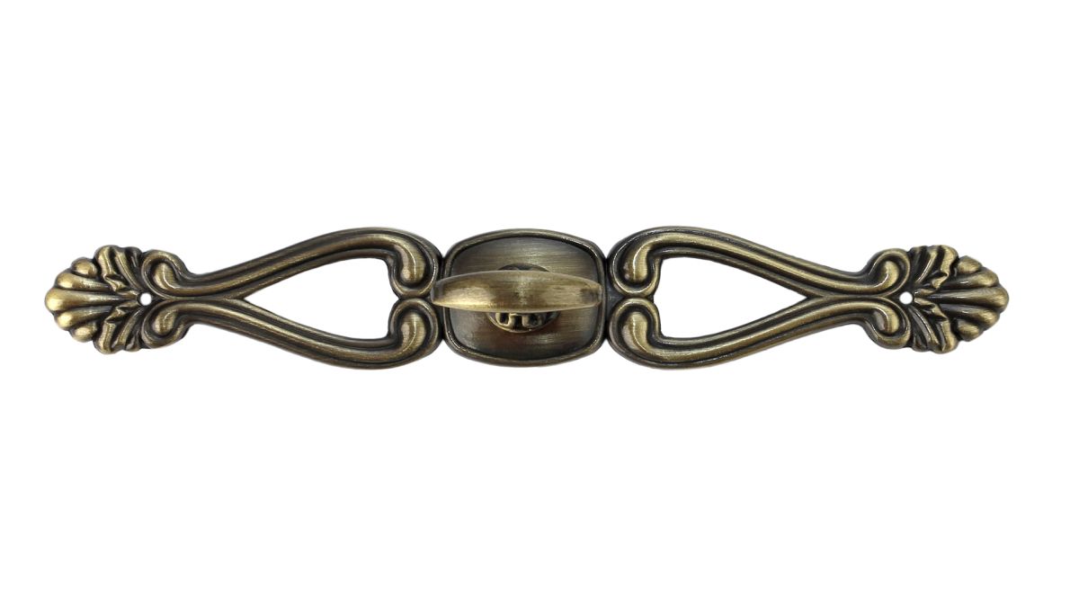 RC026.3 - создана для мебели в классическом стиле: комодов, прикроватных тумб, гарнитуров в прихожую, сервантов. Кнопка представлена в сложном цветовом решении с эффектом времени «Старинная латунь». Модель хорошо сочетается с фасадами с фрезеровкой белых, бежевых, горчичных, ореховых оттенков.