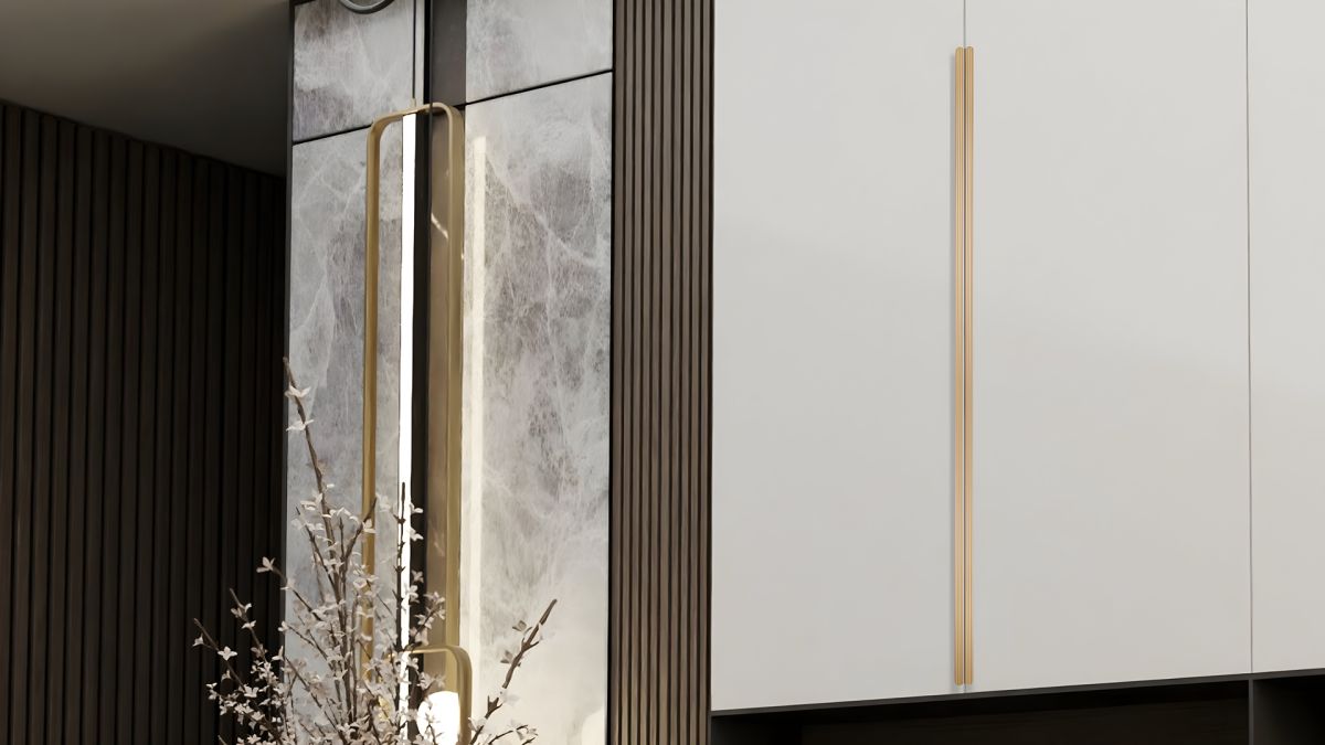 Ручка представлена как в небольших размерах от 128 мм, так и в форм-факторе 960 мм. SHELL RS064 можно устанавливать не только вертикально, но и горизонтально — для завершённого образа мебельного гарнитура.