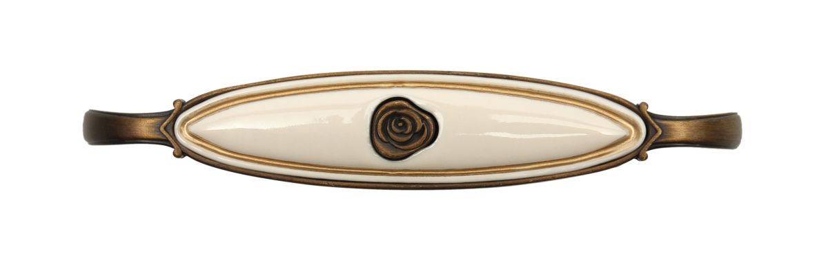 С металлом в состаренных покрытиях сочетается керамическая вставка, украшенная розой. Ручка напоминает произведение искусства – старинную камею, изящное изделие для украшения интерьера. Это не просто ручки для открывания фасада – это детали декора, создающего облик мебели.