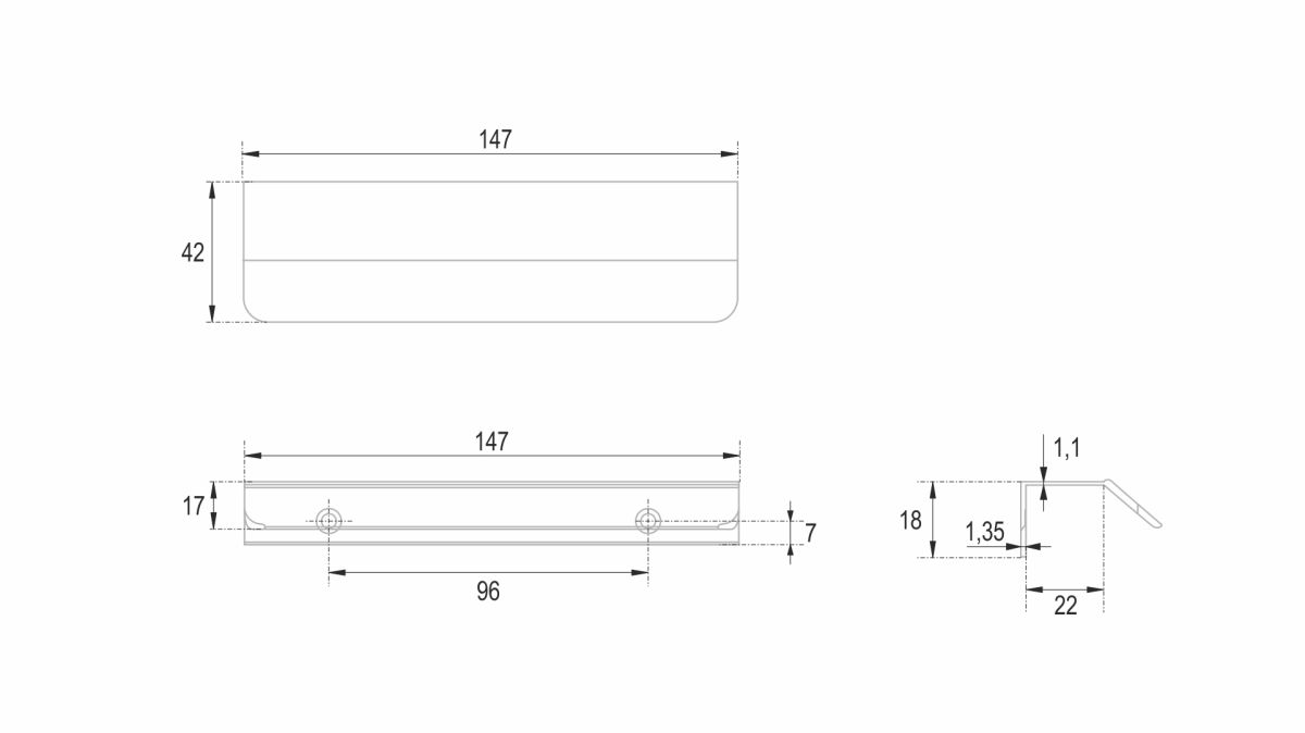 KANT RT013 можно устанавливать не только вертикально, но и горизонтально — для завершённого образа мебельного гарнитура. Модель закрепляется на верхний торец фасада, саморезы (приобретаются отдельно) вкручиваются в отверстия с фаской с задней стороны фасада.