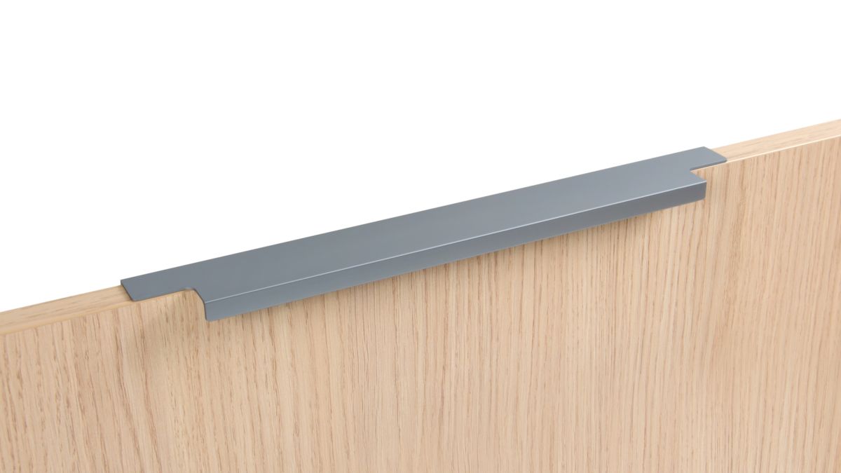 Ручка имеет богатую палитру цветовых решений и разнообразие длин. В зависимости от длины, модель допускает размещение двумя способами — «в размер» фасада и по центру широких фасадов (как большой «язычок»).