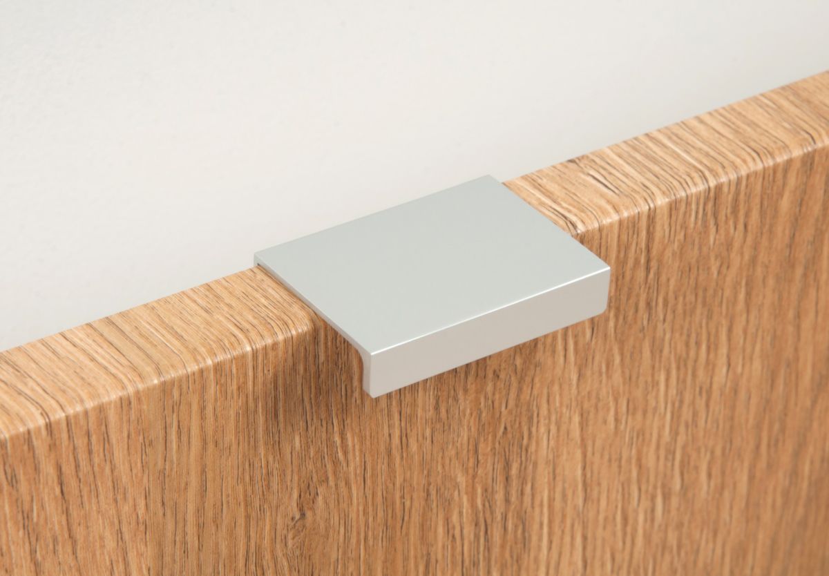 Ручка имеет богатую палитру цветовых решений и разнообразие длин. В зависимости от длины, модель допускает размещение двумя способами — «в размер» фасада и по центру широких фасадов (как большой «язычок»).