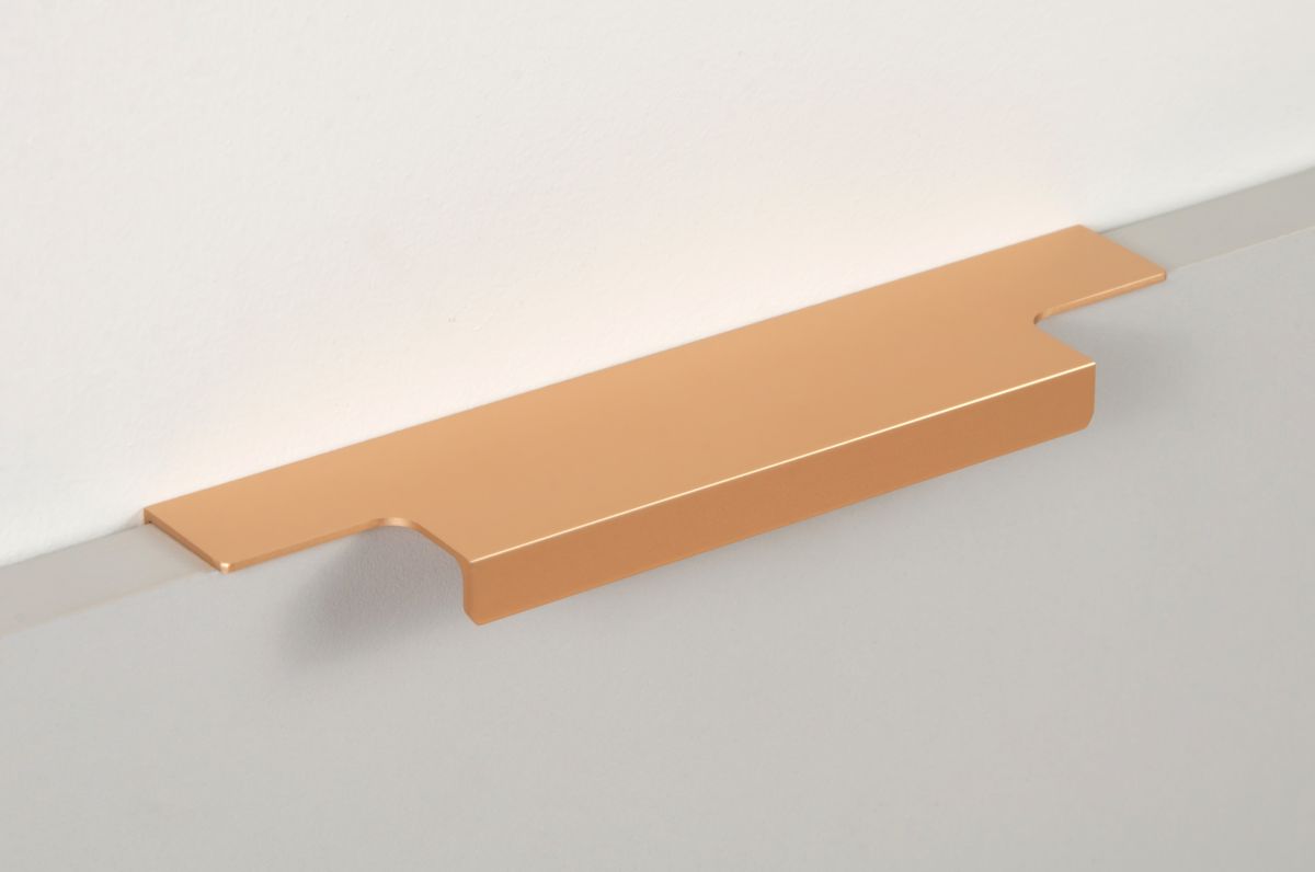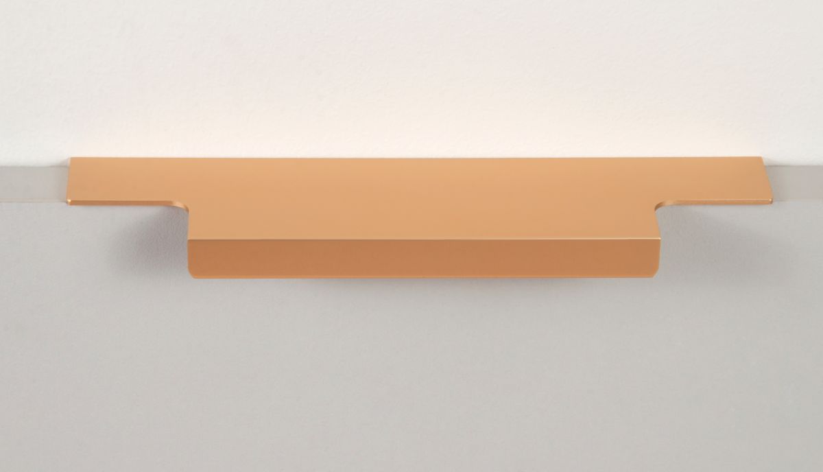 Ручка имеет богатую палитру цветовых решений и разнообразие длин. В зависимости от длины, модель допускает размещение двумя способами — «в размер» фасада и по центру широких фасадов (как большой «язычок»).