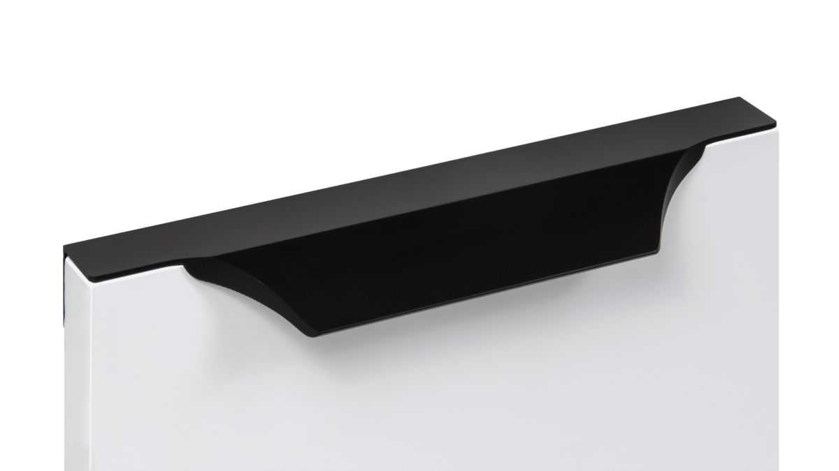 WING RT114 — торцевая ручка с изгибом из алюминия, устанавливается наложением на фасады толщиной 18,8 мм (в цветах BL,GR,SC,SG) и 18,5 мм (в цвете W).