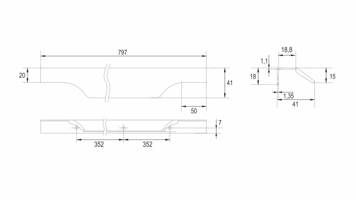 WING RT114 — торцевая ручка с изгибом из алюминия, устанавливается наложением на фасады толщиной 18,8 мм (в цветах BL,GR,SC,SG) и 18,5 мм (в цвете W).