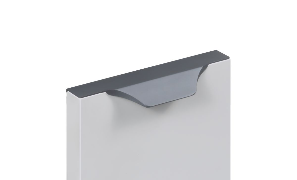 WING RT114 — торцевая ручка с изгибом из алюминия, устанавливается наложением на фасады толщиной 18,8 мм (в цветах BL,GR,SC,SG) и 18,5 мм (в цвете W).