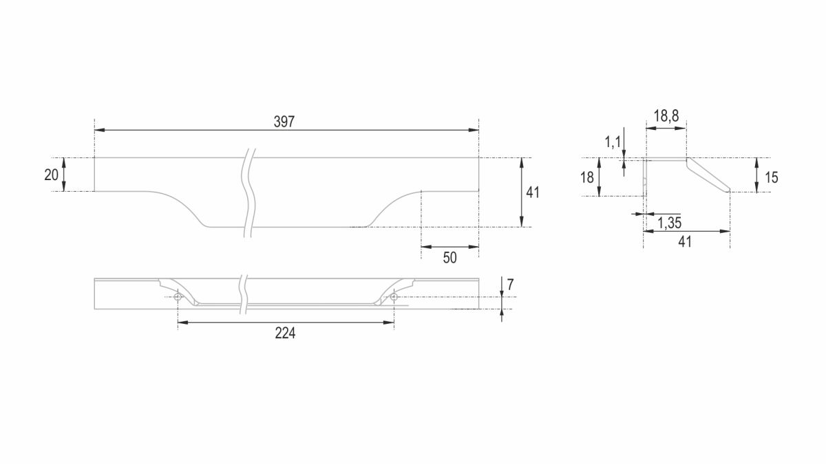 WING RT114 — торцевая ручка с изгибом из алюминия, устанавливается наложением на фасады толщиной 18,8 мм (в цветах BL,GR,SC,SG) и 18,5 мм (в цвете W).