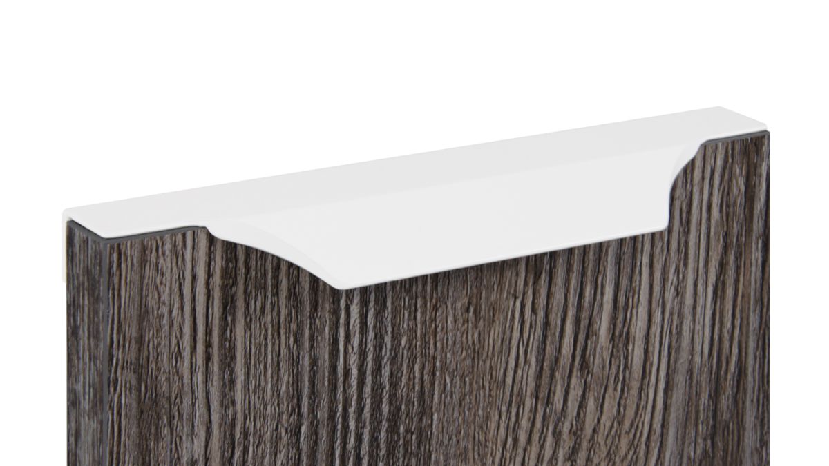 WING RT114 — торцевая ручка с изгибом из алюминия, устанавливается наложением на фасады толщиной 18,8 мм (в цветах BL,GR,SC,SG) и 18,5 мм (в цвете W).