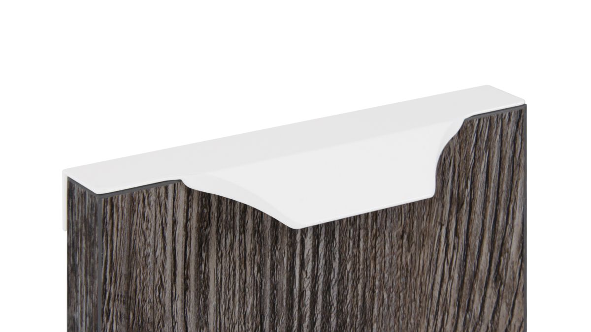 WING RT114 — торцевая ручка с изгибом из алюминия, устанавливается наложением на фасады толщиной 18,8 мм (в цветах BL,GR,SC,SG) и 18,5 мм (в цвете W).