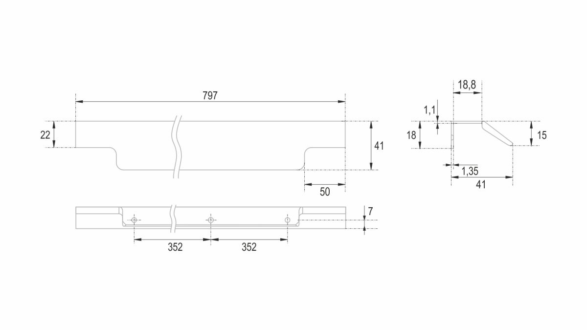 ARCA RT115 — торцевая ручка с геометричным выступом из алюминия, устанавливается наложением на фасады толщиной 18,8 мм (в цветах BL,GR,SC,SG) и 18,5 мм (в цвете W).