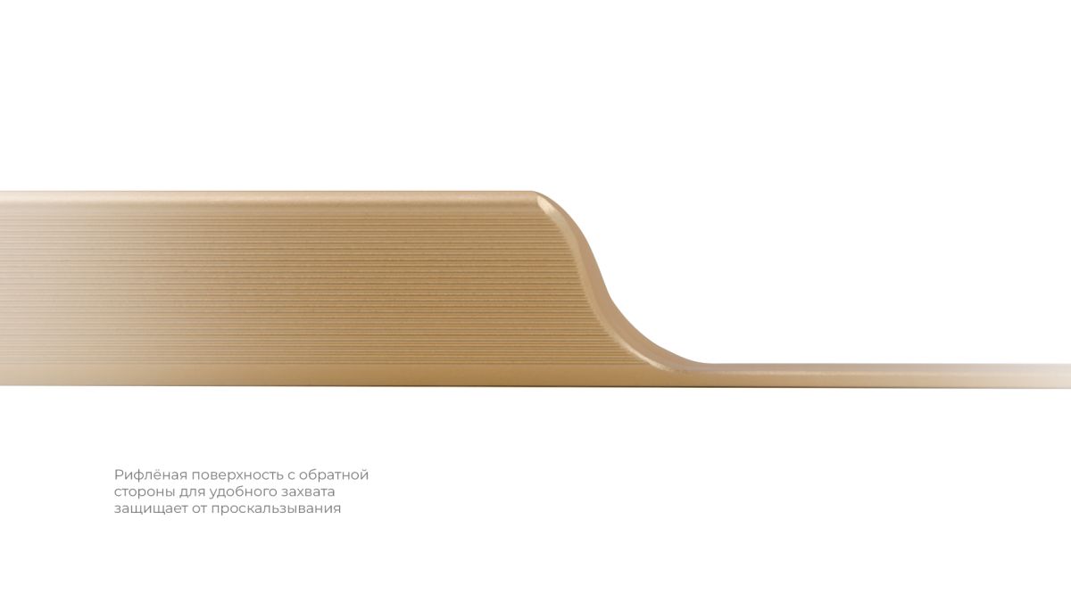 Конструкция ручки имеет детально проработанный выступ по всей длине, что создаёт эффект погружения фасада, аккуратно закрывая его края. Рифлёное покрытие в зоне захвата обеспечит эргономичное использование ручки без соскальзывания.
