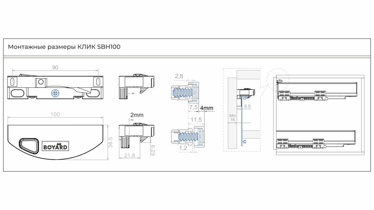 КЛИК SBH100 в своей конструкции имеет специальный «усик», создающий небольшой преднатяг, препятствующий сильному столкновению внутреннего ящика с фасадом основного ящика.