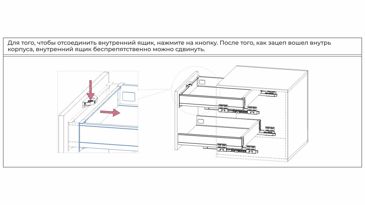 Держатель легко закрепляется на саморезы (идут в комплекте держателем) с обратной стороны фасада, и надёжно фиксирует внутренний ящик, а одним нажатием кнопки отпускает его.