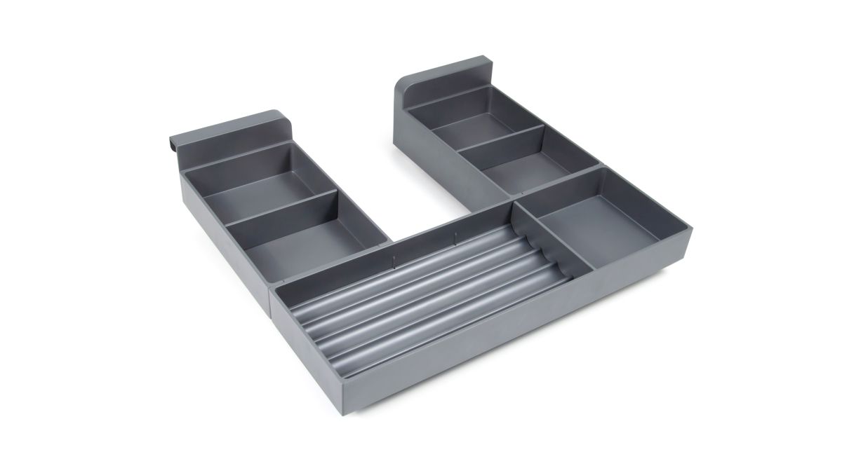 В комплект входит: фронтальный поддон, два боковых поддона, 3 съемных делителя, 1 вставка во фронтальную часть для узких длинных предметов.