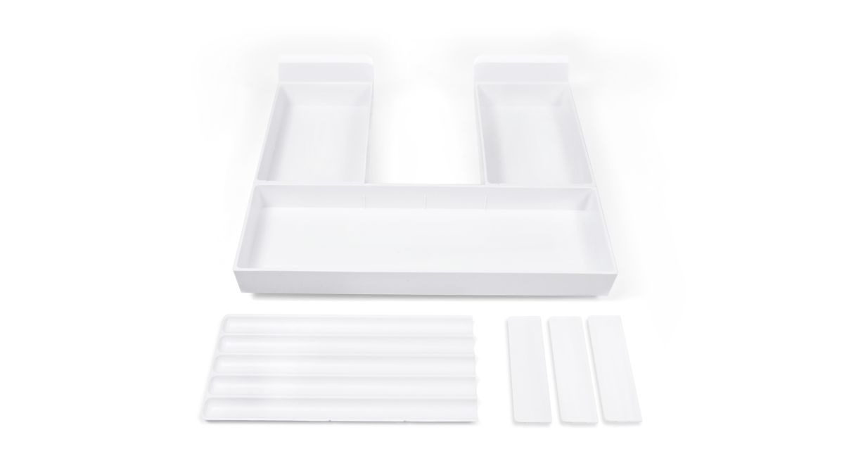 В комплект входит: фронтальный поддон, два боковых поддона, 3 съемных делителя, 1 вставка во фронтальную часть для узких длинных предметов.