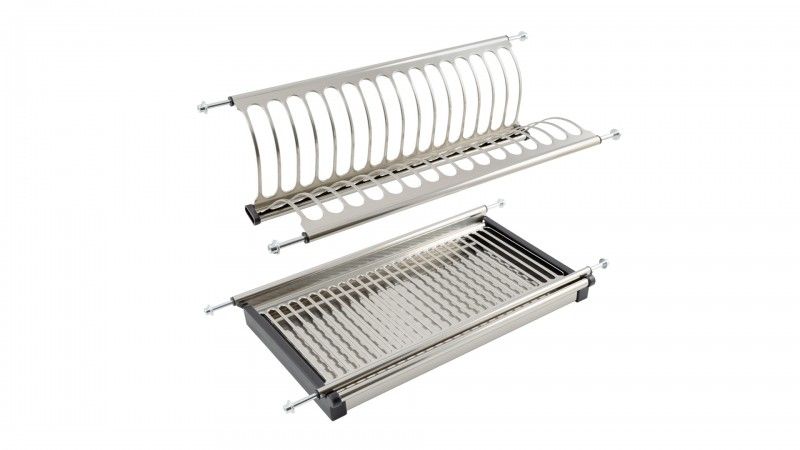 Двухуровневая сушка для посуды быстрого монтажа для современных кухонных гарнитуров позволяет размещать значительное количество вымытой посуды. Модель оснащена стальным поддоном для сбора стекающих с посуды капель воды. Одно из достоинств сушки – быстрый монтаж: конструкция монтируется в предварительно просверленные отверстия. Материал конструкции – нержавеющая сталь и пластик.