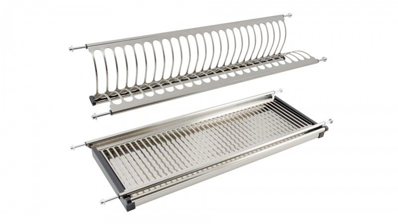 Двухуровневая сушка для посуды быстрого монтажа для современных кухонных гарнитуров позволяет размещать значительное количество вымытой посуды. Модель оснащена стальным поддоном для сбора стекающих с посуды капель воды. Одно из достоинств сушки – быстрый монтаж: конструкция монтируется в предварительно просверленные отверстия. Материал конструкции – нержавеющая сталь и пластик.