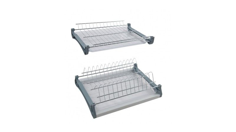 Комплект сушки включает 2 яруса для хранения посуды с надёжным гальваническим покрытием с эффектом хромирования, 2 съёмных поддона из качественного бесцветного пластика, 4 пластиковых серых держателя нижнего и верхнего уровней, переднюю и заднюю алюминиевые трубки, саморезы для монтажа сушки и крепления трубки.