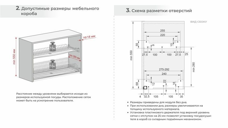 Габаритная глубина держателя верхнего уровня - всего 255 мм, что позволяет устанавливать сушку в компактных модулях со складным подъёмным механизмом!