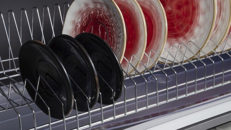 Особая форма прутков нижнего уровня позволяет по-настоящему удобно расположить в пространстве сушки большое количество посуды любого диаметра – от крошечных кофейных блюдец до габаритных сервировочных тарелок. При этом необязательно размещать посуду по центру, удобно ставить её и в дальние, и в ближние сектора сушки.