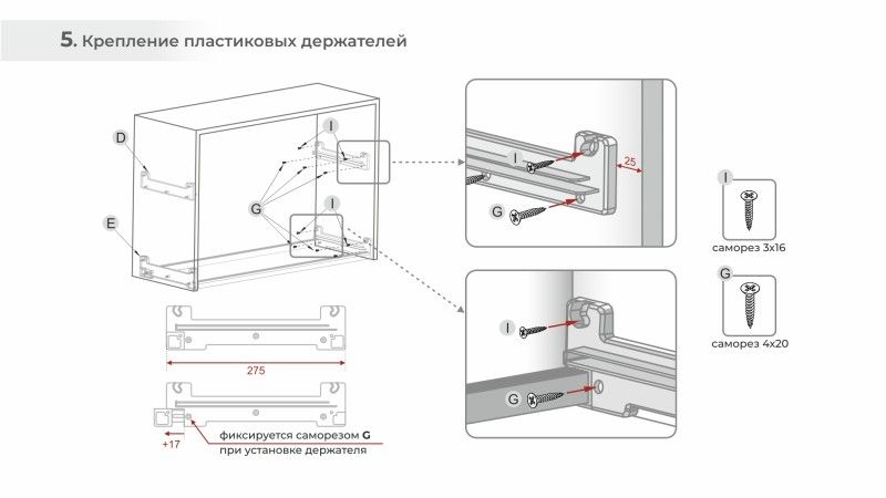 Регулируемый нижний держатель допускает установку в короб с внутренней глубиной от 280 мм и монтаж задней стенки 4 мм в паз.
