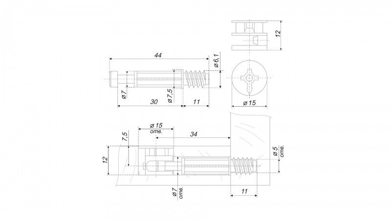 ST01/51 — эксцентриковая стяжка диаметром 15 мм и высотой 12 мм, расстояние до центра сверления под эксцентрик – 34 мм. Предназначена для соединения деталей из плит толщиной от 16 мм.
